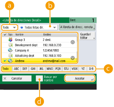 Para utilizar la libreta de direcciones remota, pulse <A libreta de direcc. remota>. Cuando aparezca <Cambiar libreta direcciones>, pulse <Cambiar libreta direcciones>