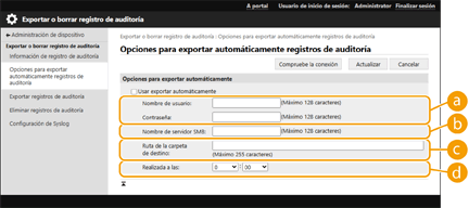 Tras exportar automáticamente los registros de auditoría con éxito, los registros de auditoría recogidos se eliminan automáticamente. No se pueden eliminar manualmente. Una vez exportados y eliminados automáticamente los registros de auditoría, se genera cada registro. Si no se producen otras recopilaciones de registro antes de la siguiente hora de exportación automática, no se exportará automáticamente el registro de auditoría. También puede exportar manualmente los registros de auditoría desde la IU remota. Exportar un registro como archivo Si falla la exportación automática, el equipo volverá a intentarlo varias veces. Aparece un mensaje de error en el panel de control del equipo si falla la exportación automática incluso una vez. Especifique un servidor SMB para Windows Server 2016 o posterior, o Windows 10 o posterior. Si el equipo está apagado, la exportación no se realizará, incluso en la hora especificada. Además, no se realizará cuando el equipo se recupere. Si el equipo está en el modo de reposo, automáticamente se recuperará y realizará la exportación en la hora especificada. Tenga en cuenta que está usando un servidor no compatible con la comunicación cifrada SMB 3.0/3.1, por lo que los datos de registro de auditoría viajan sin cifrado a lo largo de rutas de comunicación durante su exportación automáticamente. Dependiendo de su entorno, la exportación automática de registros se puede realizar mucho después de la hora especificada. |