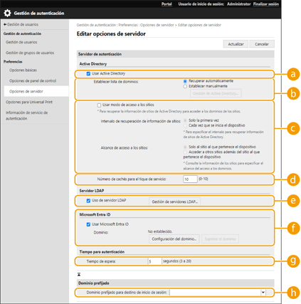 4 | Introduzca la información necesaria. ![]() [Nombre de dominio]Introduzca el nombre de dominio del Active Directory que es el destino de inicio de sesión (Ejemplo: empresa.dominio.com). [Nombre de NetBIOS]Introduzca el nombre de dominio de NetBIOS (Ejemplo: empresa). [Nombre de host primario o dirección IP] / [Nombre de host secundario o dirección IP]Introduzca el nombre de host del servidor Active Directory o la dirección IPv4. Si utiliza un servidor secundario, especifique el nombre en [Nombre de host secundario o dirección IP]. Ejemplo: Uso de un nombre de host: ad-server1 Uso de una dirección IPv4: 192,168.18,138 [Nombre de usuario] / [Contraseña]Introduzca el nombre de usuario y la contraseña para acceder al servidor Active Directory y buscar. [Punto de inicio de la búsqueda]Especifique la ubicación (nivel) para acceder y buscar información de usuario durante la autenticación del servidor Active Directory. [Nombre de inicio sesión] / [Aparece como] / [Dirección de e-mail]Especifique los campos de datos (nombres de atributo) del nombre de inicio de sesión, el nombre visualizado y la dirección de correo electrónico de cada cuenta de usuario en el servidor Active Directory (Ejemplo: sAMNombreCuenta, cn, mail). |