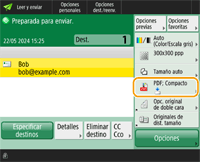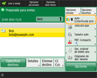 Comprobar el número total de destinos especificadosEn la parte superior derecha de la pantalla se muestra el número total de destinos especificados. Esto le permite confirmar antes de proceder al envío que el número de destinos es correcto. ![]() Para cancelar inmediatamente un trabajo que se está enviandoSi pulsa (Detener) en el panel de control mientras se está enviando un trabajo, aparecerá el mensaje <¿Desea cancelar el siguiente trabajo de envío?>. Pulse <Sí> para cancelar el envío.Puede seleccionar <Último trabajo recibido> o <Trabajo que se está enviando> seleccionar el trabajo que desea cancelar. <Trabajo que se cancelará al pulsar Detener> Pulse (Detener) cuando haya varios trabajos de envío que mostrar en la pantalla para seleccionar el trabajo de envío que desea cancelar. Si no se muestra el trabajo de envío que desea cancelar, pulse <Compruebe otros trab.> para mostrar <Trabajos de envío>. Seleccione el trabajo que desea cancelar y pulse <Cancelar>.Para consultar los estados de los documentos enviados/guardadosEn la pantalla <Monitor estado>, puede consultar los estados de los documentos enviados. En esta pantalla puede volver a enviar/guardar faxes o cancelar el envío/guardado tras consultar los estados. Comprobar el estado y el registro de los documentos escaneados Cuando <Mostrar notificación cuando se acepta el trabajo> está establecido en <Sí>, la pantalla <Monitor estado> puede mostrarse desde la siguiente pantalla mostrada tras la recepción de un trabajo enviado.<Mostrar notificación cuando se acepta el trabajo> ![]() Para imprimir el informe de los resultados del envío/guardadoEn la pantalla de Funciones básicas de lectura, al pulsar <Opciones> <Informe result. de TX> puede configurar que se imprima automáticamente el informe con la lista de resultados del envío/guardado.Para establecer esto para cada trabajo en <Opciones>, es necesario seleccionar <Sólo en caso de error> o <No> en <Informe result. de TX> y, a continuación, configurar <Permitir impresión desde opciones> en <Sí>. Nombre de archivoCuando se envía/guarda un archivo, el nombre de archivo se establece automáticamente según el formato siguiente. Puede cambiar la configuración para poder asignar un nombre. Configurar un nombre de archivo Al enviar por correo electrónico "Números de trabajo (cuatro dígitos)_números de página (tres dígitos).nombre de extensión de archivo", como "1042_001.jpg" Al guardar en un servidor de archivos "El año, mes, día, hora, minuto y segundo en que se guarda el archivo (14 dígitos).nombre de extensión de archivo", como "20151030133541.jpg" Asunto del correo electrónicoEl asunto introducido en <Asunto prefijado> se establece automáticamente (<Asunto prefijado>). Si especifica un asunto distinto, cambie la opción o especifíquelo cada vez que envíe un correo electrónico (Especificar las opciones de correo electrónico). |