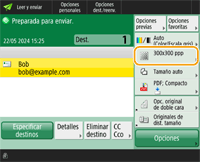Determinar la parte superior e inferior del originalPuede configurar la orientación del documento antes de escanear, de modo que la parte superior e inferior queden bien colocadas cuando se muestre el archivo enviado/guardado en un ordenador. Al colocar un original de tamaño A4, pulse <Opciones> en la pantalla Funciones básicas de lectura <Orientación contenido orig.> <Arriba en el borde más lejano> <Aceptar>.Al colocar originales de gran tamaño como A3, pulse <Opciones> en la pantalla Funciones básicas de lectura <Orientación contenido orig.> seleccione <Arriba en el borde más lejano> o <Arriba en el borde lateral> en función de la orientación del original pulse <Aceptar>.Especificar múltiples destinos, incluidos faxesSi establece <Permitir Fax en función Leer y enviar> en <Sí>, puede especificar destinos de fax en la pantalla Scan Basic Features (Funciones básicas de lectura) (<Mostrar función de fax>). Esta opción resulta útil para especificar múltiples destinos, incluidos faxes, como, por ejemplo, al guardar una copia de un fax enviado en un servidor de archivos. Comprobar imágenes escaneadas antes de enviar/guardarPuede comprobar imágenes escaneadas en la pantalla de vista preliminar antes de enviar/guardar. Comprobar originales escaneados antes de enviar/guardar (Vista preliminar) Registrar opciones de uso frecuentePuede combinar destinos de uso frecuente y opciones de lectura en un botón del equipo para su uso posterior. Pulsando el botón registrado al escanear originales puede completar rápidamente sus opciones. Registrar una combinación de funciones de uso frecuente |