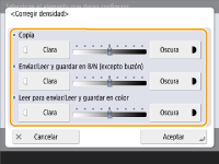 Si se configura hacia el lado <Oscura>, se incrementan las áreas impresas con la densidad máxima. Si se configura hacia el lado <Clara>, las áreas de relleno, el texto y las líneas podrían imprimirse como tonos medios donde faltan puntos. Esta opción debe utilizarse principalmente para ajustar las densidades intermedias.