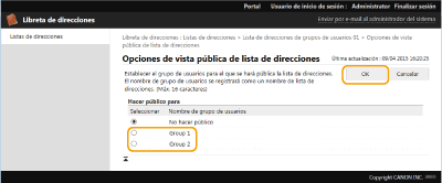 Para gestionar las Listas de direcciones de grupos de usuarios, también puede permitir únicamente a los usuarios con privilegios de Administrador registrar/editar los destinos desde la IU remota. <Usar lista de direcciones de grupos de usuarios>