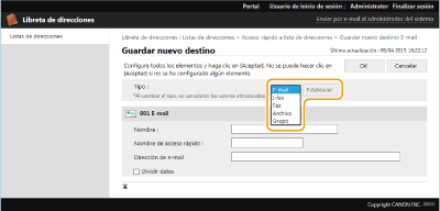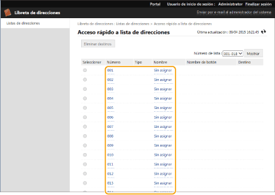[Lista de direcciones para administradores] solo está disponible para los administradores que inicien sesión con privilegios de Administrador o DeviceAdmin (Administrador de dispositivo).
