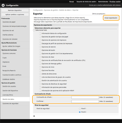 seleccione el nivel de seguridad en [Nivel de seguridad] haga clic en [Iniciar exportación]