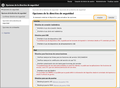 Las opciones del equipo relativas a la seguridad de la información se pueden aplicar y gestionar en lote. Es recomendable que el administrador de la seguridad de la información encargado de gestionar la política de seguridad la aplique al equipo siguiendo la política de su organización. Para configurar la política de seguridad, inicie una sesión en la IU remota con privilegios de administrador.
