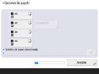 Compruebe que el papel cargado en el origen de papel está bien especificado. ![]() ![]() Si los tamaños del papel son correctos, pulse <Aceptar>. Para obtener información en pantalla e instrucciones sobre cómo cambiar las opciones, consulte Especificación del tamaño y tipo de papel en el casete. Si no ha iniciado sesión como administrador, continúe con el paso 10. | |