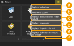 <Personnaliser pour util. perso.>: Choisir cette option pour personnaliser l'écran Accueil pour l'utilisateur actuel. Les réglages par défaut pour <Personnaliser pour util. perso.> suivent les réglages pour <Personnaliser pour util. com.>.