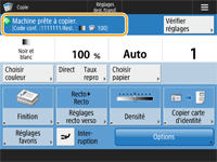 Affiche l'état des réglages, comme l'agrandissement, le format papier et le nombre de copies. Veillez à vérifier les réglages afin de copier correctement. Pour modifier les réglages, appuyez sur le bouton sous la section affichage.