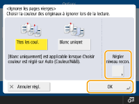 Pour sauter tous les originaux vierges quelles que soient leurs couleurs, sélectionnez <Ttes les coul.>. Pour sauter les originaux vierges uniquement en blanc, sélectionnez <Blanc uniqmt>.