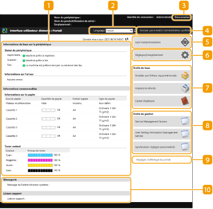Certains éléments et fonctions de l'affichage ne sont disponibles que si vous vous connectez avec des privilèges Administrateur. Si plusieurs utilisateurs utilisent l'interface utilisateur distante en même temps ou si le panneau de commande de l'appareil est utilisé en même temps que l'interface utilisateur distante, la dernière opération exécutée est appliquée. |
