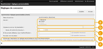 Lorsqu'un client annule la synchronisation des réglages personnalisés, le client ne pourra plus récupérer les réglages pour chaque utilisateur enregistré sur le serveur. En conséquence, les données personnalisées d'une machine qui était un client ne contiendront peut-être pas les dernières données après l'annulation de la synchronisation des réglages personnalisés.