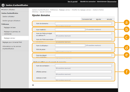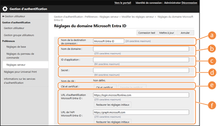 Pour spécifier un Active Directory/serveur LDAP/Microsoft Entra ID comme dispositif d'authentification supplémentaire, vous devez enregistrer les informations du serveur utilisé pour l'authentification. Effectuez un test de connexion si nécessaire.