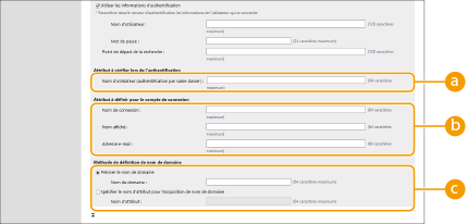 Saisissez la chaîne de caractères enregistrée pour l'attribut spécifié dans [Attribut utilisateur à rechercher]. Pour définir les privilèges en fonction du groupe auquel l'utilisateur appartient, saisissez le nom du groupe.