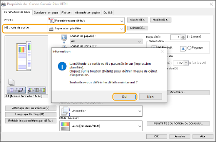Sélectionnez [Impression planifiée] depuis [Méthode de sortie] et cliquez sur [Oui].