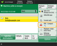 Pour vérifier le nombre total de destinataires spécifiésLe nombre total de destinataires spécifiés est indiqué en haut à droite de l'écran. Cela vous permet de vérifier que le nombre de destinataires est correct avant de faire l'envoi. ![]() Annulation immédiate d'une tâche en cours d'envoiSi vous appuyez sur (Stop) sur le panneau de commande pendant l'envoi d'une tâche, le message <Annuler la tâche d'envoi suivante ?> s'affiche. Appuyez sur <Oui> pour annuler l'envoi.Vous pouvez sélectionner <Dernière tâche reçue> ou <Tâche en cours d'envoi> pour choisir la tâche à annuler. <Tâche à annuler si l'on appuie sur Arrêter> Lorsqu'il y a plusieurs tâches d'envoi, appuyez sur (Stop) pour afficher l'écran afin de sélectionner la tâche d'envoi à annuler. Si la tâche d'envoi que vous voulez annuler n'est pas affichée, appuyez sur <Vérifier autres tâches> pour afficher <Envoyer les tâches>. Sélectionnez la tâche que vous voulez annuler, et appuyez sur <Annuler>.Pour vérifier les statuts pour les documents envoyés/sauvegardésDans l'écran <Suivi statut>, vous pouvez vérifier les statuts pour les documents envoyés/sauvegardés. Cet écran vous permet d'envoyer/sauvegarder de nouveau des documents ou d'annuler l'envoi/sauvegarde après avoir vérifié les statuts. Vérification de l’état et du journal des documents scannés Lorsque <Afficher notification à l'acceptation de la tâche> est réglé sur <Oui>, l'écran <Suivi statut> peut s'afficher à partir de l'écran suivant qui apparaît après la réception d'une tâche. <Afficher notification à l'acceptation de la tâche> ![]() Pour imprimer le rapport pour les résultats de l'envoi/sauvegardeSur l'écran des fonctions de base de numérisation, vous pouvez appuyer sur <Options> <Rapport résultat TX> pour pouvoir configurer l'impression automatique du rapport listant les résultats de l'envoi/l'enregistrement.Pour définir cette option pour chaque tâche à partir des <Options>, il est nécessaire de sélectionner <Erreur seulement> ou <Non> dans <Rapport résultat TX>, puis de définir <Autoriser impression dans Options> sur <Oui>. Nom de fichierLorsqu'un fichier est envoyé/enregistré, son nom de fichier est automatiquement défini sur la base du format suivant. Vous pouvez changer le réglage pour qu'un nom de fichier différent soit attribué. Définir un nom du fichier Pour envoyer par e-mail Format "Numéros de tâche (quatre chiffres)_numéros de pages (trois chiffres).nom d'extension de fichier", par exemple "1042_001.jpg" Pour enregistrer dans un serveur de fichiers Format "Année, mois, jour, heure, minute et seconde d'enregistrement du fichier (14 chiffres).nom d'extension de fichier", par exemple "20151030133541.jpg" Sujet du courrielLe sujet saisi dans <Objet par défaut> est défini automatiquement (<Objet par défaut>). Si vous spécifiez un sujet différent, changez le réglage ou spécifiez-le à chaque fois que vous envoyez un e-mail (Spécification des réglages courriel). |