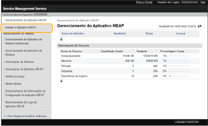 Você pode consultar a quantidade de aplicativos instalados e o espaço utilizado no dispositivo de armazenamento. Gerenciando aplicativos MEAP Se o aplicativo MEAP não tiver um número de acesso para a licença, o fornecedor do aplicativo MEAP fornecerá também o arquivo de licença. A chave de acesso e o arquivo de acesso descritos nesta seção não são necessários. Para obter mais informações, consulte o manual fornecido com o aplicativo MEAP. Dependendo do aplicativo MEAP, condições específicas para a instalação podem ser necessárias. Para obter mais informações, consulte o manual do usuário para o aplicativo MEAP que estiver usando. A quantidade máxima de aplicativos MEAP que pode ser instalada nesta máquina é 19. |