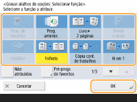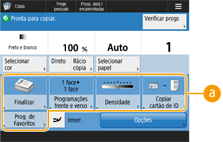 O número de itens de configuração localizados na tela de Recursos básicos e o local de exibição variam de acordo com as funções. Um botão de atalho não será exibido se <Unassigned> estiver configurado como atalho. O limite do número de atalhos para <Opções> que você pode registrar é o seguinte: Cópia: 5 Fax: 4 Digitalização e envio: 2 |