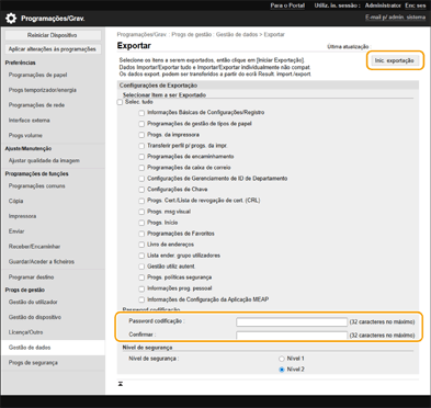 selecione o nível de segurança em [Nível de segurança] clique em [Inic. exportação]