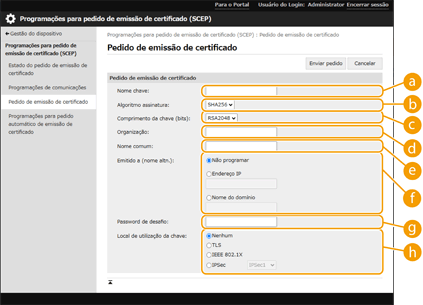 Uma solicitação de emissão de um certificado necessário para as chaves geradas com a máquina pode ser enviada a um servidor SCEP (Simple Certificate Enrollment Protocol) que gerencia certificados. Os certificados emitidos pelo servidor SCEP são automaticamente registrados na máquina. É necessário ter privilégios de Administrator para enviar uma solicitação de emissão de certificado.