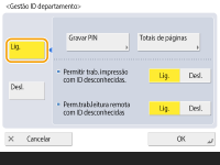 Certifique-se de que os IDs de departamento foram configurados para os usuários registrados na máquina. Registrando informações de usuário no dispositivo local O gerenciamento de ID de departamento é válido apenas para usuários registrados no dispositivo local. Se você fizer login como um usuário com privilégios de administrador, o ID e PIN de gerenciamento do sistema serão atribuídos automaticamente e serão gerenciados como um ID de departamento. |