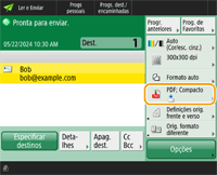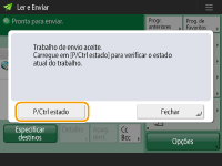 Para verificar o número total de destinos especificadosO número total de destinos especificados é exibido no canto superior direito da tela. Isso permite que você confirme que o número de destinos está correto antes do envio. ![]() Para imediatamente cancelar um trabalho que está sendo enviadoSe você pressionar (Stop) no painel de controle enquanto um trabalho é enviado, a mensagem <Cancelar o trabalho de envio seguinte?> aparecerá. Pressione <Sim> para cancelar o envio.Você pode selecionar <Último trabalho recebido> ou <Trab. a ser env.> para escolher o trabalho que será cancelado. <Trab. a canc. qd carreg. em Parar> Pressione (Stop) quando houver múltiplos trabalhos de envio para exibir na tela de seleção do trabalho de envio que será cancelado. Se o trabalho de envio que você deseja cancelar não for exibido, pressione <Verif. outros trabalhos> para exibir <Trbs envio>. Selecione o trabalho que você deseja cancelar e pressione <Cancelar>.Para verificar o status para documentos enviados/armazenadosNa tela <Contr. estado>, você pode verificar os status de documentos enviados/salvos. Esta tela permite que você envie/salve documentos novamente depois de verificar seus status. Verificando status e registro de documentos digitalizados Quando<Mostrar notificação quando trabalho for aceite> estiver configurado como <Ligado>, a tela <Contr. estado> poderá ser exibida a partir da seguinte tela, que é exibida depois que um trabalho enviado é recebido. <Mostrar notificação quando trabalho for aceite> ![]() Para imprimir o relatório de resultados de envio/armazenamentoNa tela de Recursos básicos de digitalização, pressione <Opções> <Relatório result. TR> para configurar a impressão automática do relatório listando os resultados do envio/salvamento.Para configurar essa opção para todos os trabalhos de <Opções>, é necessário selecionar <Só para erros> ou <Desligado> em <Relatório result. TR> e depois configurar <Permitir a partir de Opções> como <Ligado>. Nome do arquivoQuando um arquivo é enviado/armazenado, o nome de arquivo é configurado automaticamente baseado no seguinte formato. Você pode alterar as configurações para que um nome diferente seja designado. Definindo um nome de arquivo Ao enviar um e-mail no formato "Número de trabalhos (quatro dígitos)_número de páginas (três dígitos).nome da extensão do arquivo", como "1042_001.jpg" Ao salvar um arquivo em um servidor de arquivos "O ano, mês, dia, hora, minuto e segundo que o arquivo foi salvo (14 dígitos).nome da extensão do arquivo", como "20151030133541.jpg" Assunto do e-mailO assunto inserido em <Default Subject> é automaticamente configurado como (<Default Subject>). Caso você especifique um assunto diferente, mude a configuração ou especifique cada hora em que envia um e-mail (Especificando as configurações de e-mail). |