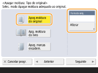 <Apag.moldura>.1 | Pressione <Apagar moldura do original> e verifique <Formato orig.>. ![]() Se o tamanho exibido em <Formato orig.> for diferente do tamanho do original, pressione <Alterar> para selecionar o tamanho. Apenas os tamanhos de original mostrados no display de toque podem ser digitalizados. |