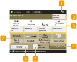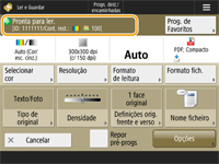 Ao pressionar <Ler e Guardar> na tela <Home>, depois pressionar <Rede> ou <Suporte de memória> para digitalizar os originais, a seguinte tela de configuração é exibida.