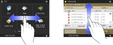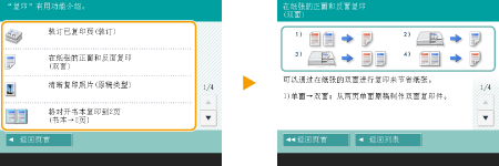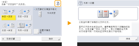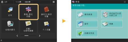查看功能指南和常见问题页面按<教程/常见问题>会显示介绍本机功能以及使用复印和扫描等功能提示的屏幕。要进一步了解可用功能和使用方法时,请查看此屏幕。也可以从移动设备访问常见问题页面。 ![]() 示例1:复印功能教程 从列表中选择项目时,将显示教程屏幕。 ![]() 示例2: 显示常见问题页面 按<常见问题>显示QR代码。然后可以通过在智能手机或平板电脑等移动设备上扫描此QR代码来显示本机的常见问题页面。 ![]() 使用“帮助”功能根据正在显示的功能,有时会在屏幕右上方显示 。按 可查看功能的说明和操作方法。![]() 按<结束通信>会返回前一屏幕。 与智能手机的操作方式相同(轻拂/拖放)在部分屏幕上,可以通过将手指上/下或左/右轻轻滑动屏幕来切换页面或进行滚动,如同使用智能手机一样。 ![]() ![]() 也可以禁用轻拂操作。<使用滑动翻页功能> <反转屏幕色彩>设置为<打开>时,无法使用轻 拂操作和拖放操作。<反转屏幕色彩> 在具有可移动按钮的屏幕上,可以拖放按钮进行移动。 ![]() |