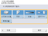 可以在<选项>中将基本功能屏幕(用于复印、传真、与扫描)上显示的设置按钮更改为其他设置按钮。在基本功能屏幕上定位常用设置按钮,可以更高效地使用相关功能。另外,使用个人认证管理进行登录时,可以为每个用户显示不同的自定义基本功能屏幕。