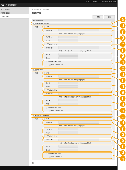 如果<登录屏幕显示设置>设置为<设备操作开始时显示>,将启用注销后显示内容的设置。要在激活自动重置模式后显示内容,请将<自动重置时间>设为1分钟或更长时间。