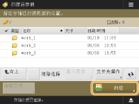 如果 <连接存储介质时选择选项>设置为<打开>,如果插入存储介质,则会显示<扫描后存储到存储介质>的快捷键。按<扫描后存储到存储介质>并继续到步骤4。
