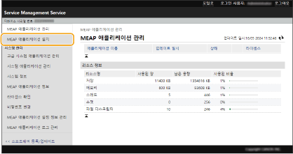 MEAP 응용 프로그램에 따라 사용 설명서 또는 관련 소프트웨어를 다음 URL에서 다운로드할 수 있습니다. http://canon.com/fau/downloads 설치와 동일한 절차로 MEAP 응용 프로그램 버전을 업그레이드할 수 있습니다. 설치하기 전에 SMS 화면에서 MEAP 응용 프로그램을 중지하십시오. MEAP 응용 프로그램 관리 응용 프로그램이 사용할 수 있는 최대 저장 장치 용량은 약 1.3GB입니다. |