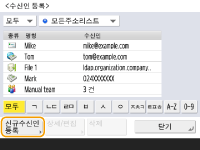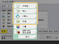 ![]() | 스캔한 문서를 전송할 때 사용할 수 있는 수신자의 팩스 번호나 이메일 주소를 주소록에 등록할 수 있습니다. 또한 I-팩스 수신인, 파일 서버 폴더 위치(IP 주소 및 경로) 및 Canon 복합기의 저장소(고급 박스)를 주소록에 수신인으로 등록할 수 있습니다. |