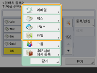 LDAP 서버가 기기에 이미 등록된 경우(LDAP 서버 등록) 수신인을 검색하고 원터치 버튼에 등록할 수 있습니다. <수신인/전송 설정> <원터치 등록>을 누르고 등록하려는 원터치 버튼을 선택한 후 <등록/편집> <LDAP 서버>를 누르고 <조건으로 검색>을 사용하여 수신인을 검색합니다. 수신인 설정을 확인한 후 <원터치 명칭>을 누르고 표시할 원터치 버튼 이름을 입력한 후 <확인>을 누릅니다.사용자 이름과 비밀번호가 올바르지만 검색 결과가 비어있는 경우 LDAP 서버와 기기의 시간 설정을 확인하십시오. LDAP 서버와 기기 사이의 시간 설정이 5분 이상 차이나는 경우 검색을 수행할 수 없습니다. 주소록과 달리 등록할 수신인을 한 번에 한 명 이상 선택할 수 없습니다. LDAP 서버를 통하여 획득할 수 있는 정보는 이름 및 팩스 번호/주소만으로 구성됩니다. 필요에 따라 <삭제/편집>에서 다른 정보를 등록합니다. 전송 이력에서 주소 등록<상황확인> 화면에서 전송된 작업 로그로부터 원터치 버튼에 수신인을 등록할 수 있습니다. 이를 통해 팩스 번호와 기타 수신인 정보를 수동으로 입력하는 수고를 덜 수 있고 올바르게 등록되지 않은 수신인 정보 사용으로 인한 잘못된 전송 예방에도 도움이 됩니다. 전송된 작업 로그에 주소를 지정하고 <원터치> 수신인 등록 < >을 누르면 원터치 버튼에 다양한 수신인 정보 항목을 등록하는 화면.송신 및 수신한 문서의 상태와 로그 확인 스캔한 문서의 상태 및 로그 확인 |