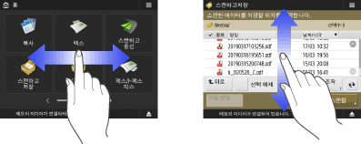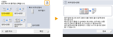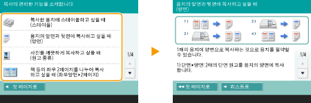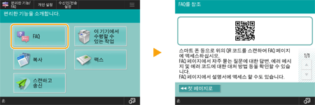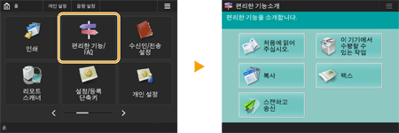 기능 가이드 및 FAQ 페이지 보기기기의 기능으로 수행할 수 있는 작업뿐 아니라 복사, 스캔 등을 사용하기 위한 팁을 소개하는 화면을 표시하려면 <편리한 기능/FAQ>를 누릅니다. 사용 가능한 기능과 사용 방법에 대해 자세히 알아보려는 경우 이 화면을 봅니다. 모바일 장치에서는 FAQ 페이지에도 액세스할 수 있습니다. ![]() 예 1: 복사 기능 지침 목록에서 항목을 선택하면 지침 화면이 표시됩니다. ![]() 예 2: FAQ 페이지 표시 <FAQ>를 누르면 QR 코드가 표시됩니다. 그러면 스마트폰이나 태블릿과 같은 모바일 장치에서 이 QR 코드를 스캔하여 기기의 FAQ 페이지를 표시할 수 있습니다. ![]() 도움말 기능 사용표시되는 기능에 따라 이 화면 상단 오른쪽에 때때로 표시됩니다. 기능 설명 및 작동 방법을 확인하려면 을 누릅니다.![]() <통신 종료>를 누르면 이전 화면으로 돌아갑니다. 스마트폰과 같은 방법으로 작동합니다(넘기기/끌어서 놓기)일부 화면에서는 스마트폰을 사용할 때처럼 손가락으로 화면에서 위/아래 혹은 왼쪽/오른쪽으로 넘기며 페이지를 전환하거나 스크롤할 수 있습니다. ![]() ![]() 넘기기 작동을 비활성화할 수도 있습니다. <플릭 기능 사용> <화면색 반전>을 <설정>으로 설정한 경우 넘기기 작동과 끌어서 놓기 작동을 사용할 수 없습니다. <화면색 반전> 이동 가능한 버튼이 있는 화면의 경우 버튼을 끌어서 놓아 이동할 수 있습니다. ![]() |
