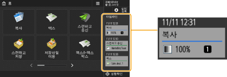 타임라인에 표시되는 아이콘 및 항목에 대한 내용은 타임라인에 표시되는 항목을 참조하십시오. 각 로그인 사용자에게 타임라인을 표시할 수 있습니다. 로그인하지 않은 경우, 미인증 사용자 및 게스트 사용자와 같이 인증을 사용하지 않는 사용자에게 공유 타임라인을 표시할 수 있습니다. 필요에 따라 <미인증 사용자의 타임라인 표시> 및 <인증 사용자마다 타임라인 표시>의 설정을 변경하십시오. <홈> 화면 사용자 정의 인증되지 않은 사용자 및 게스트 사용자와 같이 인증을 사용하지 않는 사용자의 타임라인은 <주전원 고속기동 설정>를 <설정>으로 설정하고 빠른 시작을 수행할 때 유지됩니다. <주전원 고속기동 설정>를 <해제>로 설정한 상태에서 전원을 끄거나 빠른 시작을 수행할 수 없는 경우 인증되지 않은 사용자 및 게스트 사용자와 같이 인증을 사용하지 않는 사용자의 타임라인이 삭제됩니다. 타임라인을 가져오거나 내보낼 수 없습니다. 설정 데이터 가져오기/내보내기 |