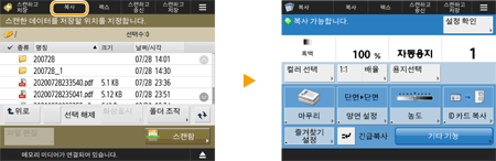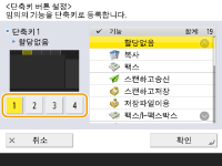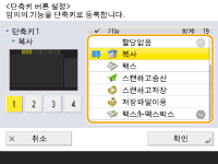 <홈> 화면의 기능에 대한 단축 키 버튼을 생성할 수 있습니다. <홈> 화면으로 돌아가지 않고 다른 기능에 액세스하려면 이 버튼을 사용합니다. 단축 키를 생성하려면 관리자 권한으로 로그인하십시오. 기기에 로그인하기