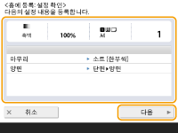 <복사> 를 누르고 복사 설정을 지정합니다. <홈> 화면