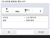 <호출시에 확인 화면을 표시> 및 <호출시 조작 시작 (버튼을 누르면 작업이 시작됩니다.)>를 위해 <설정>을 선택하면 확인 화면의 <예>을 선택한 뒤 복사가 시작됩니다.