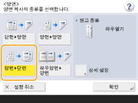 원고 방향을 지정하려면 <상세 설정>을 누르십시오. 원고의 앞면과 뒷면의 위-아래 방향이 같은 경우 <좌우열기>를 선택합니다. 원고의 앞면과 뒷면의 위-아래 방향이 반대인 경우 <상하열기>를 선택합니다.