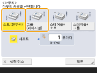마무리 기능에 따라 옵션 장치를 설치해야 할 수도 있습니다. 옵션 장비 용지 유형에 따라, 마무리 기능을 사용하지 못할 수 있습니다. 하드웨어 사양 원고를 원고대에 배치하는 경우복사 기본 기능 화면에서 <기타 기능> <연속스캔>을 누르면 원고가 원고대에 배치되어 있어도 한 부씩 인쇄/그룹 기능을 사용할 수 있습니다.그룹 출력 중에 각 페이지 사이에 작업물 구분기 삽입<그룹 (페이지별)>을 선택한 경우 각 그룹 사이에 작업 구분 종이를 삽입할 수 있습니다. 자세한 내용은 <그룹간 구분종이>를 참조하십시오. <그룹간 구분종이> <저장파일 이용>에서 설정 구성 시PDF/XPS 파일을 인쇄할 때만 마무리 기능을 사용할 수 있습니다. |