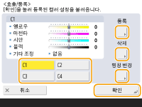 조정한 후 최대 4개 설정을 등록할 수 있습니다. 색상을 조정한 후 <호출/등록>을 누릅니다. <C1> ~ <C4> 버튼 중에서 선택합니다. <등록> <예> <확인>을 차례로 누릅니다.![]() ![]() 등록된 설정을 호출하려면 <호출/등록>을 누르고, 버튼을 선택하고, <확인>을 누릅니다. <C1> ~ <C4>의 버튼 이름을 변경할 수 있습니다. 변경할 버튼을 선택하고, <명칭변경>을 누르고, 새 이름을 입력합니다. 등록된 설정을 삭제하려면 버튼을 선택하고, <삭제> <예>를 차례로 누릅니다. |