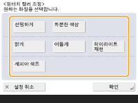 <기타 기능>  <컬러조정>의 설정은 선택한 이미지 품질에 따라 자동으로 변경됩니다. <세피아 색조>를 선택할 경우 <모노컬러 (세피아 색조)>가 기본 기능 화면의 <컬러 선택>에 표시됩니다. |