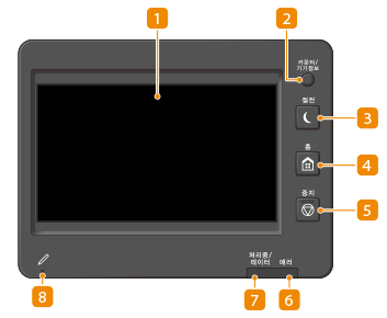 설정 메뉴와 복사 및 스캔과 같은 기능을 액세스할 수 있도록 하는 <홈> 화면을 표시하려면 누릅니다.
