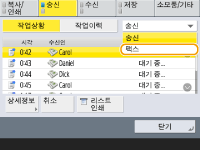 여러 개의 전송 작업이 있을 때 취소할 전송 작업을 선택하기 위한 화면을 표시하려면 (중지)을 누릅니다. 취소하려는 전송 작업이 표시되지 않으면 <기타 작업 확인>을 눌러서 <송신 작업 일람>을 표시합니다. 취소하려는 작업을 선택하고 <취소>를 누릅니다.