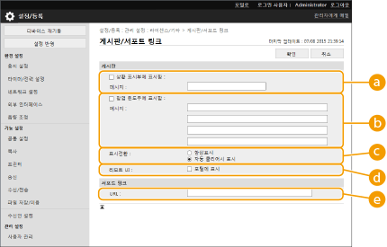 ![]() | 사용자에게 전달할 메시지를 터치 패널 화면에 표시할 수 있습니다. 메시지는 터치 패널 화면의 하단이나 별도의 팝업 창에 표시할 수 있으며, 메시지 유형이나 사용자 유형에 따라 표시 방법을 선택할 수 있습니다. 팝업 창에 메시지를 표시하면 리모트 UI의 포털 페이지에도 동일한 메시지를 표시할 수 있습니다. 이러한 설정을 구성하려면 관리자 권한이 필요합니다. |