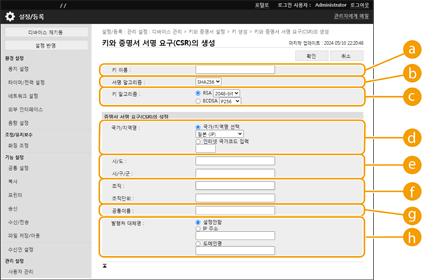 기기에 키와 CSR을 생성할 수 있습니다. CSR 데이터를 화면에 표시하거나 이를 파일로 내보내기 하는것도 가능합니다.