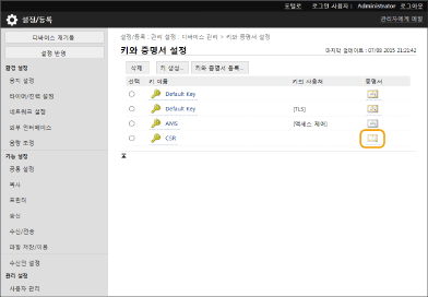 CSR을 생성한 키가 키 및 인증서 목록 화면에 표시되지만, 단독으로는 사용할 수 없습니다. 이 키를 사용하려면, CSR을 바탕으로하여 이후에 발행된 인증서를 등록해야 합니다. 키에 인증서 등록하기 |