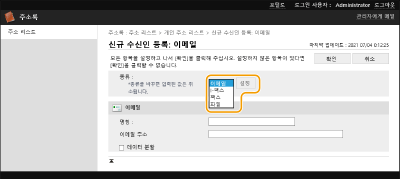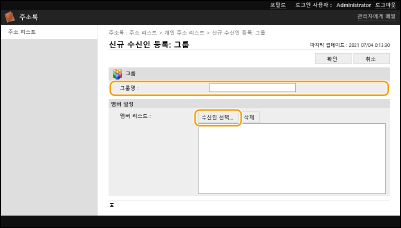 1 | 수신인을 등록할 주소 목록을 클릭합니다([개인 주소 리스트], 사용자 그룹 주소 목록, [주소 리스트 01] ~ [주소 리스트 10] 또는 [관리자용 주소 리스트]). [개인 주소 리스트]은 로그인한 사용자만 사용할 수 있으며 개인 인증 관리가 활성화 됬을 때만 사용이 가능합니다. [관리자용 주소 리스트]은 관리자 또는 장치 관리자 권한으로 로그인한 사용자만 사용할 수 있습니다. PIN 입력 페이지가 표시되면 PIN 입력 후 [확인]을 클릭합니다. 등록된 사용자 그룹과 수신인을 공유하려면 등록된 사용자 그룹 주소 목록을 선택합니다. ![]() 또한 관리자 권한이 있는 사용자만 리모트 UI에서 수신인을 등록/편집할 수 있도록 허용하여 사용자 그룹 주소 목록을 관리할 수 있습니다. <사용자 그룹 주소 리스트를 사용> |